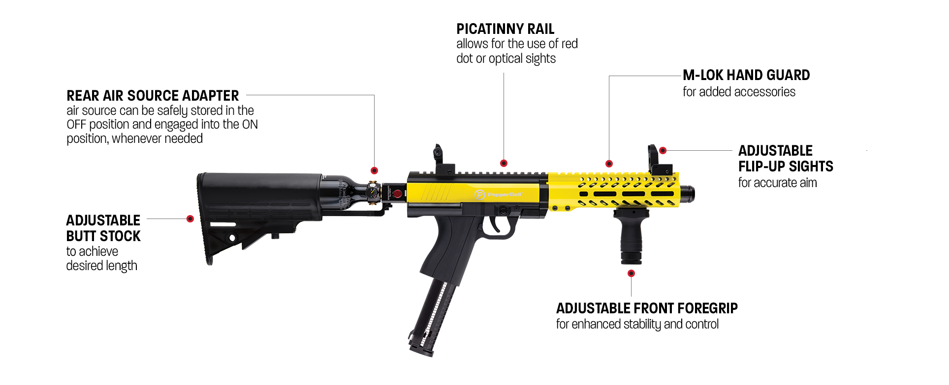 The PPC™ offers a robust and portable solution for patrol officers in need of a reliable non-lethal option. Designed for practicality and ease of operation, the PPC is lightweight, making it an ideal choice for officers on the move. It is compatible with PepperBall .68 caliber round or VXR projectiles, offering versatility in various law enforcement situations. The PPC™ can be powered by either HPA or an 88-gram single-use CO2 cartridge, providing flexibility depending on operational needs.