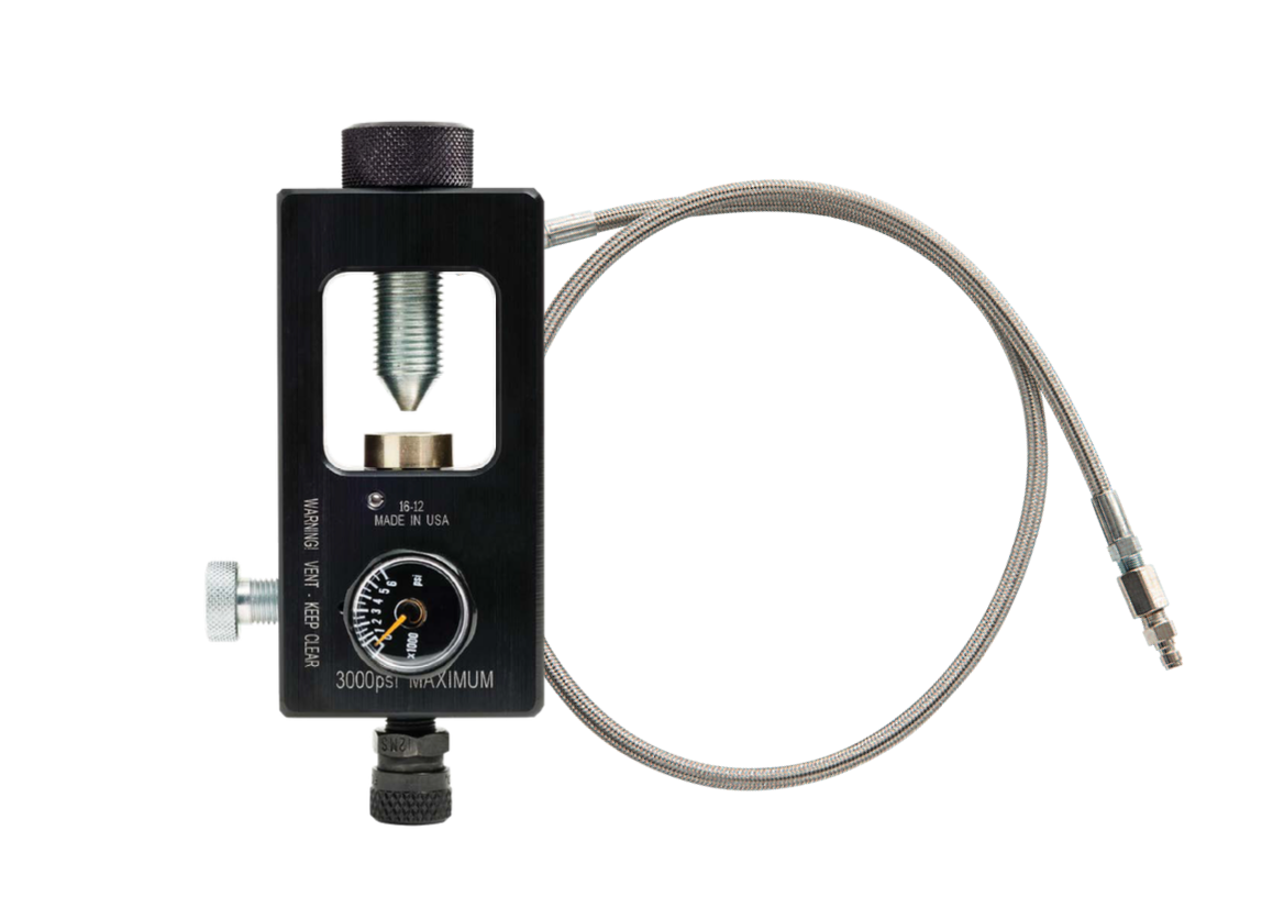 The PepperBall® Scuba Air Fill Adapter and Whip connects Scuba tank to PepperBall HPA bottles for refill.