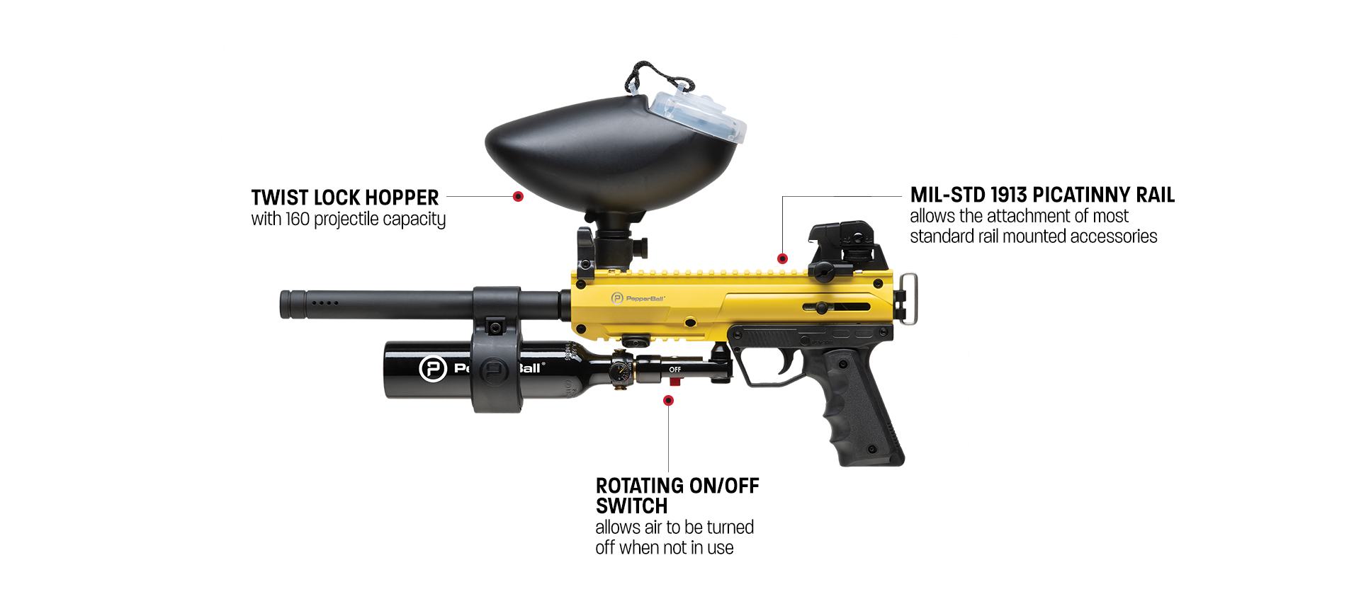 Understanding the demands of law enforcement, the FTC PRO™ is built for endurance and efficiency. It comes with a large-capacity hopper that holds up to 160 standard round projectiles, reducing the need for frequent reloading. The 13 cubic inch high-pressure air system supports prolonged use, crucial in extended crowd management scenarios and the MIL-STD-1913 rail allows officers to attach necessary accessories, enhancing its utility in a range of policing tasks.