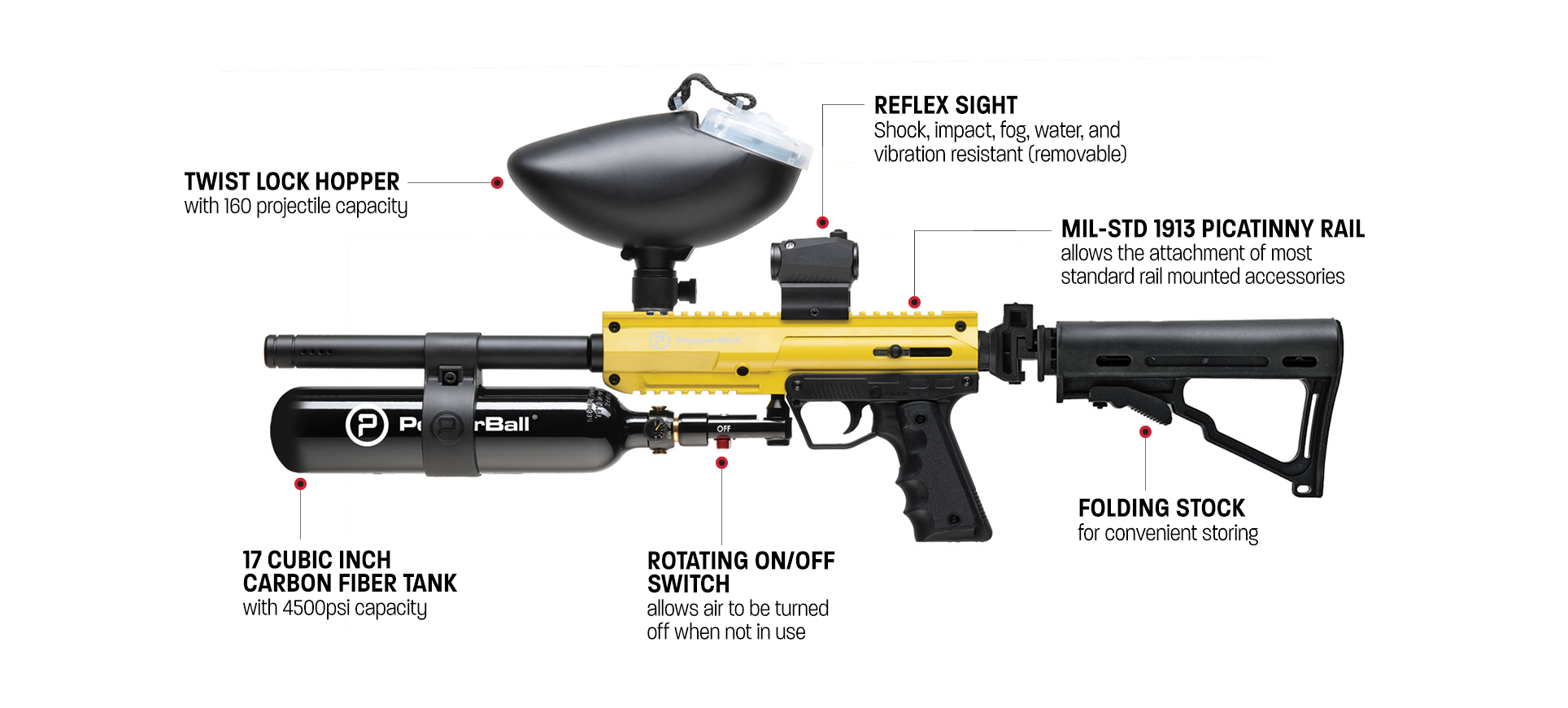 A high-capacity hopper that can accommodate up to 160 standard round projectiles, significantly minimizing the frequency of reloads. This is complemented by a premium 15 Cubic Inch 4500psi capacity carbon fiber tank, designed for sustained operation, a key factor in managing long-duration crowd control or other high intensity situations. Additionally, the MIL-STD-1913 rail provides the flexibility for officers to add various attachments.